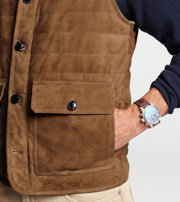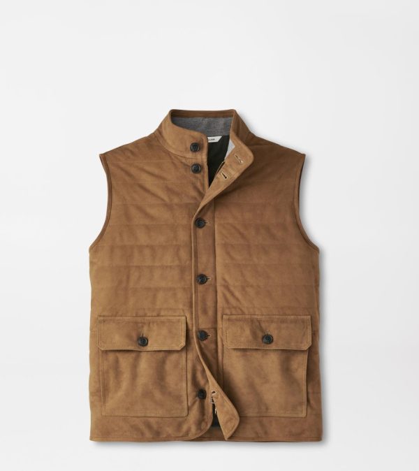 Experience exceptional craftsmanship with this premium seasonal vest, expertly crafted from luxurious Italian suede that provides reliable wind and water resistance for superior protection against the elements. The distinctive channel-stitched design and refined wool trim deliver timeless heritage sophistication. Features a sophisticated stand-up collar, classic button-front closure, and practical exterior side pockets for everyday convenience.